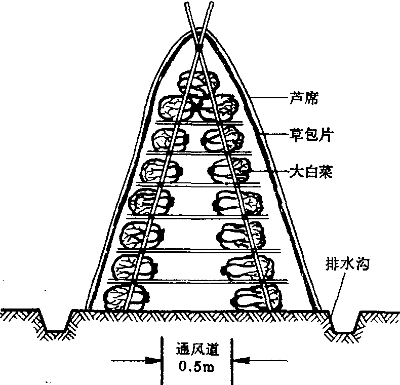 马架式堆藏大白菜示意图 堆藏的关键在于对堆内温度的控制。为及时了解堆内温度变化,要在堆内埋入测温套管,放入温度表,定时观测,以调节覆盖物厚度与覆盖方法。田间堆藏,可在菜堆周围堆放一层新鲜松枝,以避鼠害。 堆藏store up蔬菜、水果的一种简易贮藏方法。直接将收获后的产品堆放于遮荫、干燥的田间地面、浅坑、室内或场院中。堆垛的大小、高度依产品种类和地区气候特点而定。表面可覆盖芦蓆、秸秆或塑料薄膜,以保持堆内适宜的温、湿度,防止产品受热、受冻及日晒、雨淋等。堆藏适用于中纬度地区蔬菜的冬藏和高纬度地区秋菜的短贮。例如,大白菜、甘蓝的浅坑堆藏,洋葱、马铃薯的室内垛藏等。 |