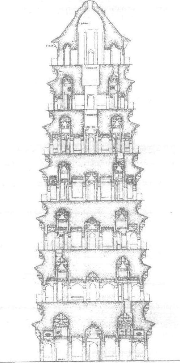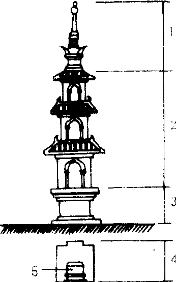 塔的结构示意图 1.塔刹 2.塔身 3. 基座 4. 地宫 5. 宝函 我国古塔现存三千多座,种类繁多,丰富多采。塔的分类方法有多种:如从平面形状上分,有四方形、六角形、八角形、十二角形、圆形等。以建筑材料上分,又有木、砖、石、金、银、铜、铁、琉璃砖瓦造的等等。从佛教教义上讲,又有所谓生身舍利、法身舍利、各种宗教派的塔等等。为了概括和突出古塔在我国古建筑中的艺术造型与结构形式予以分类,大约有楼阁式塔、密檐式塔、亭阁式塔、花塔、覆钵式塔、金刚宝座式塔、过街塔及门塔、宝箧印经塔等。现选择其中比较典型的古塔,分别简述如下: 大雁塔 在陕西西安市城南慈恩寺内。唐高宗永徽三年(652),玄奘为贮藏从印度取回的佛经而建。塔高5层。武则天时重修,增高为10层。后经战乱破坏,只存7层。经明代修葺即今塔。塔身系青砖砌成,高64米,呈方锥体,底层各边长25米,逐层缩小。每层四面各有一券拱门。塔内呈方形,有扶梯盘旋而上,可凭栏远眺。该塔造型简洁,气势雄伟,为典型的楼阁式建筑。塔底的门楣上雕刻唐建筑图案和佛像等线刻画,门旁嵌有“大唐三藏圣教序”碑刻,均是唐代珍贵文物。 祐国寺塔 在河南开封市内。建于宋皇祐元年(1049),为八角十三层仿木构楼阁式砖塔,高54米多。塔身外包砌红、褐、蓝、绿各色琉璃砖,因红、褐色调近似铁色,故称“铁塔”。塔身细部的琉璃上有佛像、菩萨、飞天、狮子、宝相花等装饰花纹50多种。雕工精细,神态生动,为宋代琉璃砖雕艺术的杰作。此塔是我国现存最早最大的一座琉璃建筑。 嵩岳寺塔 在河南登封嵩岳寺内,建于北魏正光元年(520),是我国现存最早的密檐式砖塔。塔高40余米,15层,平面呈十二角形。第一层塔身特别高大,这是密檐塔的特点。塔身之上叠涩出密檐十五层,塔檐之间每面各有小窗1个。15层之上,为一巨大的仰莲瓣组成的须弥座,以承托七重相轮组成的刹身,刹顶为巨形宝珠。整个塔的外形,呈圆和的抛物线状。巍峨挺拔,雄伟壮丽。 崇圣寺三塔 在云南大理城西北原崇圣寺,三塔鼎足而立。大塔方形,中空,名千寻塔,为密檐式建筑,形状与西安小雁塔相似,高69米多,共16层,每层正面中间开券龛,置白色大理石佛像一尊。根据塔的形制和云南当时的政治、经济情况及佛教传入云南的时间分析,此塔建于唐开成(836-840)以后。南北小塔实心,八角形,各十层,均高42米。各层分别雕券龛,佛像、莲花、瑞云等,华丽庄重,两塔顶各有3个衔接的铜制葫芦。第二个葫芦上遮有八角伞,其周边系铜铃,从建筑风格上看,两塔建于五代(907-960)。 妙应寺白塔 在北京西城阜成门内。建于元至元八年(1271),因塔身外部皆抹白灰,俗称白塔。高50多米,塔基为三层方形折角须弥座,其上为半圆突起莲瓣组成的覆莲座和承托塔身的环带形金刚圈,使塔从方形折角基座过渡到圆形塔身,自然而富装饰性。硕大的覆钵形塔身,形如宝瓶,外形粗壮稳健。刹座呈须弥座式,上立着下大上小的刹身,用砖砌成相轮十三重,其上置巨大的铜制宝盖,其周边悬挂着透雕铜制流苏和铜铃。宝盖上是刹顶,为一座铜制小喇嘛塔。1978年维修时,发现塔内藏有乾隆所赐的僧服、经书等各种珍贵文物。据记载,该座塔由尼泊尔工艺家阿尼哥设计建造,是我国喇嘛塔的最早代表作。 真觉寺金刚宝座塔 在北京西直门外,明成化九年(1473)建成。塔和宝座全部用汉白玉石建造,下为高7米多的四方形宝座,座前后辟券门,内有石梯盘旋而上通向宝座顶部。座上分建五座平面方形、单层密檐塔和一座琉璃罩亭。五塔分立在宝座中心和四角。中间一座较高,有十三重檐,四角的四座均是十一层重檐。塔身及金刚宝座上全部雕刻有佛像、梵文及宗教纹饰。造型虽近似印度建筑,但结构和雕刻手法则具有我国传统的民族风格,是中国建筑吸收外来文化的创造性作品。 佛宫寺释迦塔 在山西应县城佛宫寺。建于辽清宁二年(1056),塔高67.31米,楼阁式,塔身外观五层檐,每层出平座,内部则有四个暗层,实为九层,每层均有楼梯盘旋上下。平面呈八角形。平座上绕以柱杆游廊,可供周览眺望。塔的中心为了安置佛像,以各种斜撑和支柱结合使用,增强了塔体的刚度。由于塔的结构庞大复杂,各种物件变化很大,仅斗拱就有六十多种不同尺寸与形式。是我国现存最高、最大的木塔。木塔多次受强烈地震的波及,但没有任何损害。1974年维修时,发现一批辽代写经、刻经和木板套色绢质佛像等珍贵文物,对进一步研究辽代的政治、经济、文化、宗教活动等具有重要意义。 塔是供奉和收藏佛舍利(佛骨)、佛像、佛经、僧人遗体的建筑。又称佛塔、宝塔、浮屠、佛图、浮图。中国古塔的形式来源于印度的“悉堵坡”,在印度语中是“坟”或“宗庙”的意思,是释迦牟尼去世后,各地弟子为分藏他的舍利而建的坟的形式。它由圆或方形,多边形的台基、覆钵、宝匣、相轮四部分组成,演变成中国古塔后,台基变高成塔身,下有塔基和地宫,台基以上部分缩小成为塔顶的装饰。相轮上增设宝珠、塔刹等。中国的佛塔有楼阁式塔、密檐塔、单层塔、喇嘛塔、金刚宝座塔、花塔、过街塔等多种形式。楼阁式塔有木塔和砖石结构塔,有屋檐和平台栏杆,楼层各边有门窗可以登临远眺。晚唐前,塔的平面以方形为主,宋辽时期变为八角形,也有六角形的。密檐式塔为砖石造,塔身底层最高,以上各层逐层收缩,呈