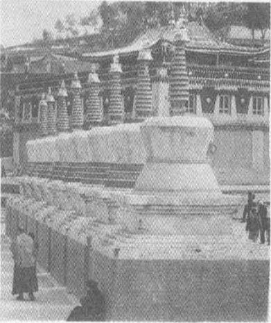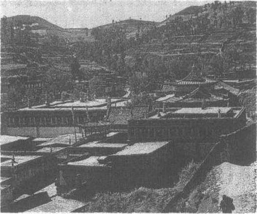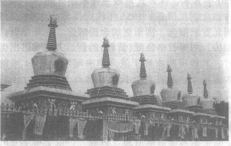 | 释义 | 塔尔寺藏传佛教格鲁派六大寺院之一。在今青海湟中县鲁沙尔镇西南隅。创建于明嘉靖三十九年(1560 ),明清两代屡有增建。全寺占地60 0余亩,最盛时有大小殿堂52座,经堂、僧舍93 0 0余间。今主要建筑有大金瓦殿、大经堂、九间殿、小金瓦殿、华寺、大拉浪、大厨房、如意宝塔、菩提塔、过门塔等。大金瓦殿为主殿,三檐歇山顶,镏金铜瓦。殿内有高11米的宗喀巴大银塔,寺名由此而来。塔身龛内有宗喀巴金像,殿内有其铜像。莲台上还供奉众多佛像。大经堂为两层平顶建筑,面阔13间,进深11间,面积1981平方米,有108根明柱。殿内悬挂堆绣佛像和壁画; 四壁龛中有上千尊镏金铜佛; 四壁经架上有数以百计的经卷。九间殿系硬山顶建筑。正中三间塑文殊、观音、金刚手三菩萨像; 北三间为如来佛、妙音仙女、财源仙女塑像; 南三间为宗喀巴和六论师塑像。小金瓦殿是护法神殿,殿内有十余尊造型奇异的金刚力士像,另有小型佛像、宝塔和经卷等。花寺系宫殿式建筑,内有释迦牟尼、十六罗汉、四大金刚等塑像。大拉浪即大方丈室,由山门、牌坊、经堂、公寓、僧舍等组成,是该寺总法台居处。酥油花、壁画、堆绣,为该寺“三绝”,主要表现宗教题材。该寺最高权力机关在大经堂,下设参尼(显宗)、居巴(密宗)、丁科(天文历算)、曼巴(医学)四个扎仓(学院)。全寺每年农历正月、四月、六月和九月举行四次大法会,十月、十二月举行小法会。1961年公布为全国重点文物保护单位。 塔尔寺位于青海省湟中县鲁沙尔镇西南隅,藏语称“衮本贤巴林”,是为纪念藏传佛教格鲁派(黄教)创始人宗喀巴,在其降生地建造的寺院。传说宗喀巴去拉萨后,其母在家乡十分想念他,遂按他的嘱托于明洪武十一年(公元1378年)建起一座莲聚宝塔。后来,其信徒们又在附近建庙宇和僧舍,到18世纪末叶成为大型寺院。现存寺庙占地约40万平方米,包括塔殿、佛殿、经堂学院、佛塔、活佛公署和僧舍等多重院落。主要建筑有大金瓦殿、小金瓦殿、长寿殿、大经堂、文殊菩萨殿、释迦佛殿、大厨房、过门塔、如来八塔等。大金瓦殿又称大金瓦寺,是塔尔寺的主殿,面积近450平方米,最初为简陋的瓦屋,清康熙五十年(公元1711年)屋顶改为鎏金铜瓦。清乾隆五年(公元1740年)在檐口安装鎏金云头、滴水和莲瓣,殿内正中的大银塔前陈设了金灯、象牙、法器等。大银塔表面镶黄金,并嵌各种珍宝,塔中佛龛里供奉宗喀巴像。殿内珍藏藏、蒙文经书数百卷。大金殿的正前方为大经堂,始建于明万历三十四年(公元1606年),是塔尔寺宗教组织的最高权力机构。1913年被火焚,1917年重建。这是一座藏式平顶建筑,面积1981平方米,面宽13间,进深11间,经堂内的108根大柱上部都雕有优美的图案花饰,外裹整幅盘龙图案的藏毯,并缀以色彩绚丽的刺绣飘带、幢、幡等。柱头两旁的雀替和上部的阑额饰有藏式风格的彩画。经堂内悬挂着各种绸缎剪堆、堆绣的多种佛像、佛教故事图及各种卷轴画,上千尊鎏金铜佛像置于四壁的神龛上,屋顶安放各种鎏金铜经幢,刹式宝瓶、宝塔、金鹿等,将大殿装点得金碧辉煌。大经堂下设四个扎仓(学院),分别研究显密宗教义,以及天文、历算、占卜、医学等学科。小金瓦殿建于明崇祯四年(公元1631年),是塔尔寺的护法神殿,原为琉璃瓦屋顶,清嘉庆七年(公元1802)年改为鎏金铜瓦屋顶。殿内供奉五勇猛明王护法神像,两侧陈列猛兽标本和毛皮。院内两侧和前方有两层藏式建筑的壁画廊。除殿堂建筑,塔尔寺还有几十座宝塔,其中最著名的是寺前的八座宝塔,建于清乾隆四十一年(公元1776年),塔的形制相同,方座、圆体、上尖,为纪念释迦牟尼一生八件大事而立。塔尔寺内建筑巍峨,殿堂辉煌,宝塔林立,除恢宏的建筑外,还有著名的“三绝”,即酥油花、壁画和堆绣艺术。酥油花是一种高超的油塑艺术,相传已有一千多年的历史,以酥油塑造各种佛像、人物、动物、亭台建筑等等,造型生动而逼真。壁画直接绘于墙壁、梁上或布幔上,染料为石质矿物,色彩绚丽,不易褪色。其内容多是宗教和神话故事,但又具浓厚的生活气息。堆绣是用各种彩色绸缎剪成所需形状,以羊毛或棉花之类充实其中,再绣于布幔上,具有较强的立体感,内容也多为佛经故事,是塔尔寺独创的藏族艺术品种之一。塔尔寺是我国藏传佛教格鲁派的六大寺院之一,每年农历正月、四月、六月、九月举行四大法会,是西北地区佛教活动中心。现为全国重点文物保护单位。