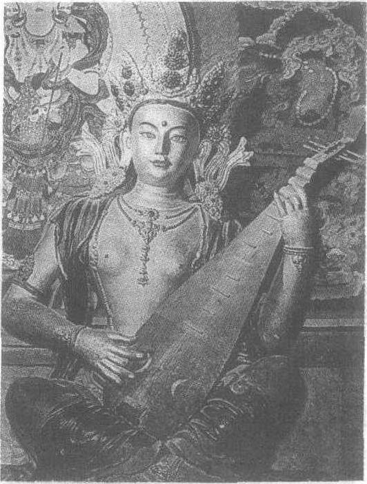 | 释义 | 塔尔寺木雕妙音仙女明晚期。通高约150厘米。青海省潢中县塔尔寺九间殿十大木雕像之一。仙女头戴刻满卷草纹、镶嵌着红绿宝石的金色花形华冠,袒胸露乳,颈佩璎珞,臂饰宝钏,玄色的通肩天衣顺肩垂下,怀抱琵琶,左手按弦,右手弹拨,头微左倾,盘腿端坐弹奏。其面庞浑圆,鼻梁高挺,眉间饰白毫相,红唇微启,凝视前方,神情自然,体态优美动人,堪称喇嘛教雕塑艺术中的珍品。