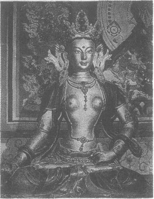 | 释义 | 塔尔寺木雕财源天女明晚期。高约150厘米。青海省潢中县塔尔寺九间殿十大木雕像之一。天女头戴镶嵌着红绿宝珠的花形金色华冠,冠带飘舞,冠坠垂肩,袒胸露乳,臂佩宝钏,玄色天衣顺肩曳下,右手捧桃于膝旁,左手按抚饰满宝珠、团花的腰带,凝目远视,盘腿端庄而坐。颈、腰饰华丽的璎珞。其宽肩细腰,眉饰白毫相,印度造像遗风明显,与前述的妙音仙女一样,是此寺著名的雕塑。