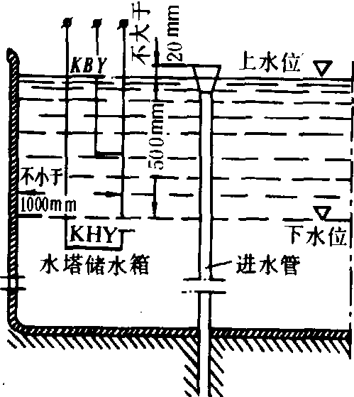 | 释义 | 塔式电泵站electric pump station with tower利用水塔标高所形成的压力,向管网供水的设施。该系统由水源、自动电泵站、供水管网、用水设备等组成。塔式电泵站校易于实现自动化,但对自动化元件的要求可靠、稳定、且具有瞬动性能,其基本元件是装在水塔储水箱内的水位传感器。水位传感器有浮子式及极板式两种,以极板式(图1)较为理想。所用电极板为250×250平方毫米的两块钢板,厚约2~3毫米,极板间距为10毫米,其中一块直接焊在钢管上,另一块固定在绝缘套管上。极板共两对,其间保持一定距离,分别与储水箱的上、下水位相对应。极板式水位传感器在储水箱中安装的尺寸如图2。在控制电路(图3)中KBY为上极板,KHY为下极板,当上、下极板全部露出水面时,电机水泵机组启动向水塔储水箱输水;当储水箱水满,极板全部浸没水中,电机停止,输水亦停止。在冬季为防止上极板的极板间隙被冰冻结,破坏自动工作,需加装一台加热变压器,以上极板间隙中的水为负载,闭合线路中的开关P,即开始加热融冰,冰融后工作恢复正常。