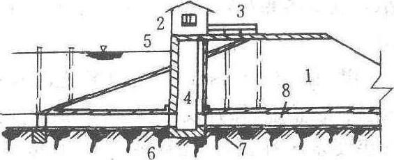 泄洪洞 1.坝 2.启闭机室 3. 工作桥 4. 竖井 5.表面取水进口 6.检修闸门 7. 工作闸门 8. 放水涵洞 |