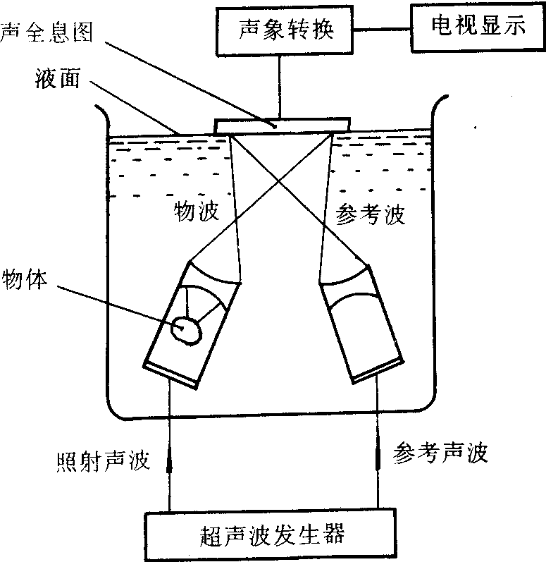 | 释义 | 声全息sheng quanxi利用声波干涉来获得被观察物体声场(物体中声波存在的区域)全部信息(振幅分布和位相分布)的声成像技术。对于可见光或x射线来说是不透明的物质,而声波都能透过这些物质。20世纪60年代中期,为了检测和显示对于可见光和x射线来说是不透明物质的结构特性,人们提出用声波代替光波的声全息技术的研究,并且迅速地得到发展和应用。声全息在原理上与光全息完全相同。声全息成像技术一般包括获得物体的声全息图和由声全息图重建物体可见像两个步骤。为了获得物体的声全息图,必须同时具备两束相干声波,一束照射到物体上透过物体后称为物波,另一束声波称为参考波,物波和参考波在一定位置相遇发生干涉,干涉图样就是物体声场的含有声波的振幅信息和位相信息的声全息图。下图是声全息的示意图。