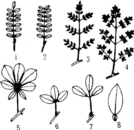 复叶的类型 1. 一回羽状复叶(奇数) 2. 一回羽状复叶(偶数) 3. 二回羽状复叶 4. 三回羽状复叶 5. 三出羽状复叶 6. 单身复叶 7. 掌状复叶 8. 三出掌状复叶 |
