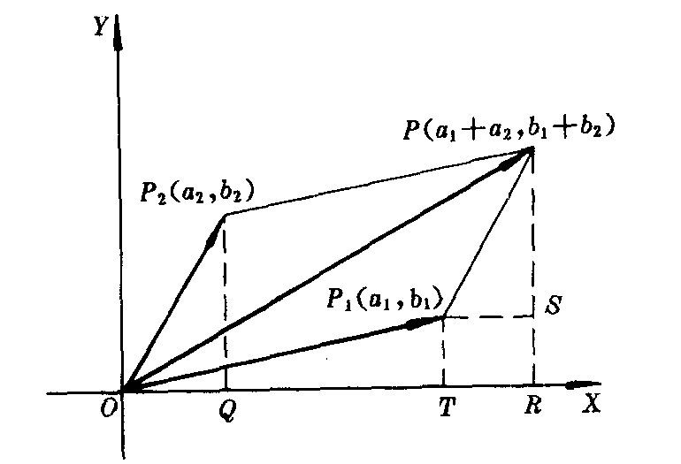 这样规定复数的加法法则与向量求和的意义是一致的.因为一个复数对应一个向量,将两个复数相加的几何意义就是求这两个复数所对应的向量之和.而求向量和是按平行四边形法则进行的.例如, ![]() 分别是复数z1=a1+b1i,z2=a2+b2i所对应的向量.如果![]() 不在一条直线上(如图),则可由平行四边形法则求得 + = .易证明△OP2Q≌△P1PS,及四边形TP1SR是矩形.故P点坐标为(a1+a2,b1+b2).因而 所对应的复数为(a1+a2)+(b1+b2)i.以上给出了复数加法的几何解释(几何意义)及用求向量和的平行四边形法则求复数的和的几何方法.即,要求两个复数z1与z2之和,可以先画出与这两个复数相对应的向量![]() .若![]() 不在同一直线上,再以这两个向量为邻边作出平行四边形,其对角线向量 所对应的复数即为所求复数z1与z2的和.若 与 在同一直线上,则可以画一个“压扁”了的平行四边形,并据此作出对角线.两个三角形式的复数求和,一般先将它们改写成代数形式之后再相加,例如.