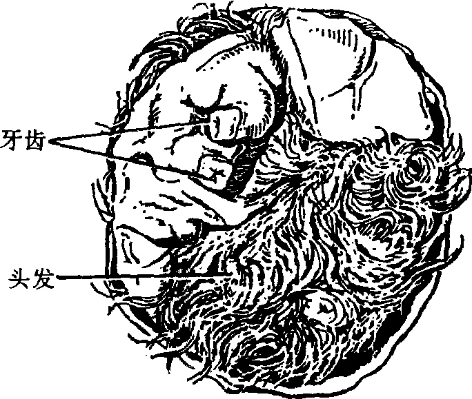 图7.3-5 卵巢良性囊性畸胎瘤(囊内可见毛发) |