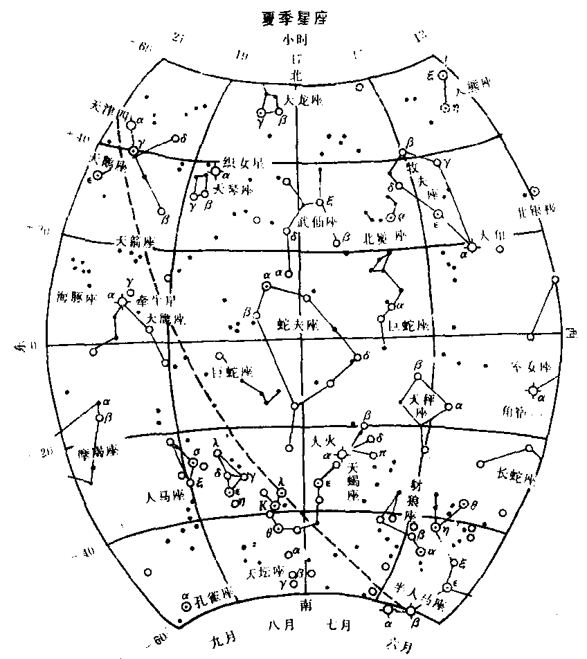 | 释义 | 夏季星空Xia ji xing kong夏季是一年中最好的观星季节,尤其在晴朗无月的夜晚,银河带及其附近的天鹅座,天鹰座,天琴座,天蝎座,人马座等特别引人注目。夏季大熊座北斗七星在西天半空、北斗七星的“斗柄”指向斜上方。美丽的天鹅座,位于银河中,座内最亮的α星是一颗白色的1等星,中名天津四,天鹅座以β为头,δ和ε星为两翼,α星为尾,构成一只伸长颈,张两翼的天鹅,飞翔于银河上。又因它的形状像个十字架,所以也有“北十字”的称号,天鹅座内有亮于4等的星22颗。天鹅座上面是天琴座,位于银河北侧,是北天中纬度主要星座。天琴座α星(织女星)是一颗白色○等星,也是北天最明亮的星,织女星与附近的一些小星排成一个三角形和一个菱形。织女星与地球距离约26.3光年。与天琴座隔河相望的是天鹰座,天鹰座是赤道附近的主要星座之一,位于银河东南侧。中心位置在赤经19时40分,赤纬3°。天鹰座α星,中名牵牛星或河鼓二、牛郎星。是一颗白色1等星。牵牛星同两旁间隔均匀的两颗小星γ、β排列成一直线,这就是有名的“牛郎三星”或“扁担星”。牛郎星和天琴座的织女星都是夏季夜空中的主要亮星。由天鹰座顺银河向南,天蝎座位于南天低空,它的范围大,明星众多,中心位置在赤经16时40分,赤纬-36°,是夏季北半球中最引人注目的星座。它的主要亮星组成一只蝎子形状出现在南方天空,其尾部指向东南。它以β和π星为头,α星为心脏,ε、μ、η、θ、λ等星为尾。天蝎座α星,中名“大火”,是一颗1等的火红色亮星,它与东西两侧的2颗星合称‘心宿三星’。天蝎座内有亮于4等的星22颗。天蝎座东面是人马座,人马座的μ、λ、Φ、δ、τ、ξ六星组成类似北斗的形状,我国称之为‘南斗’。人马座是黄道星座中最靠南的一个星座。黄道上最靠近南方的点一冬至点就在人马座内。人马座与天蝎座之间是银河最亮的区域。牧夫座在天顶的西面,牧夫座α星,中名“大角”,是一颗发红的亮星,星座内的几颗亮星组成一个多边形,像一个风筝高悬在空中。