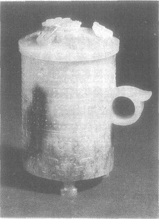 | 释义 | 夔凤纹玉樽汉。通高12.3厘米,口径6.9厘米。北京故宫博物院藏。此器用新疆和阗青玉琢磨而成,玉料上有褐色浸痕。深直腹,带盖,底部承以足。盖面上凸雕一花瓣形纽。以盖纽为中心.等距分布着3个凸雕的羊首。樽隐起三层变形的夔凤纹,其空隙处密布隐起的勾连云纹。腹中部有一环形耳,耳上阴刻兽面纹。底部的三足为马蹄形,靠近足部亦有兽面纹。此樽造型规整,纹饰严谨,刀法娴熟,抛光精细,是汉代玉雕器皿中的精品。原定名为奁,认为是盛放化妆品的。60年代,山西省右玉县大川村发现的一批汉代青铜器中,有两件器物形制与此类似。其上的铭文不仅有年号,还称此为“温酒樽”。据此确认了此物的正确名称,其用途应是酒器。