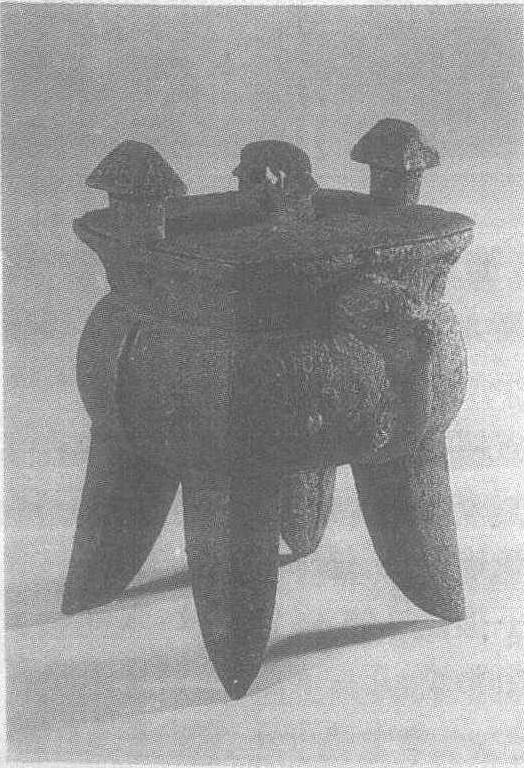 | 释义 | 夔纹铜方斝商。古代温酒器。通高21厘米,口长14.4厘米,口宽12.3厘米。重3.2公斤。1976年河南省安阳市殷墟妇好墓出土。河南省博物馆藏。此斝口略呈长方形,四角为弧形。口沿设两个四阿屋顶式矮柱,束颈鼓腹,有细棱,底略外鼓。腹一侧置兽首半环形鋬。四足粗短,呈四棱锥尖形,两内侧均有锥形浅槽。盖平而薄,短边中部各有一弧形缺口,恰可与器的双柱相合。盖中部由相背双鸟构成的拱形钮,冠相连。盖面饰对称阴线饕餮纹,腹铸对称的倒夔纹。两夔之间,有两个饕餮。此斝形体虽较小,但却别具一格。