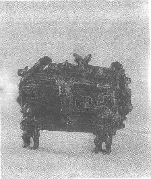 | 释义 | 夔纹铜方鼎西周。通高8厘米,长9厘米。1974年山西省闻喜上郭村出土。山西省博物馆藏。鼎,古代炊器,礼器,盛行于商周。统治者亦用作烹人之刑具。后渐演变为道士炼丹的香炉。此鼎平盖,上饰双首兽纹,嵌入器口内,上面有两伏虎。器口四隅有兽首。腹部为夔纹,四壁分附龙、虎。圈足饰重环纹,并有四人形足,作负器状。此方鼎形制奇异,装饰瑰丽,为两周之际的珍品。