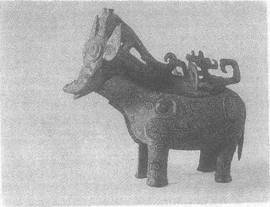 | 释义 | 夔纹铜牺尊商。古代盛洒器。通高19.2厘米,通长22厘米。1983年陕西省洋县张村出土。洋县文管会藏。此尊作牛形,竖耳,两角向内卷。项上伏有一龙,盖后部立一夔,尾均上卷。遍体均以细密的雷纹衬地,前足上饰鸟纹,后足上至臂部饰长尾夔纹。此器制作精细,造型栩栩如生,为北方出土的动物形尊中难得的佳品。金文中“尊”字为两手奉器皿形。形制有四类:一类为圆形(或方形)、侈口、圈足;一类为兽形。此器为后者类形。