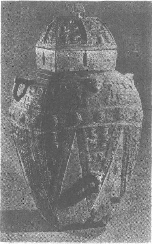 夔纹铜罍西周。盛酒、水器。通高15.8厘米,口径6.4厘米,腹深9厘米。重0.56公斤。1974年至1975年陕西省宝鸡市茹家庄出土。陕西省宝鸡市博物馆藏。此罍侈口,束颈,下腹斜收。盖上有菌状钮,肩两侧有兽首衔环双耳,下腹的一侧有兽首鋬,圈足。盖顶及肩部饰夔龙间隔圆涡纹,腹部饰三角形变体夔龙。颈部及圈足素面。此器小巧玲珑,纹饰秀丽,是西周早期一件精美的工艺珍品。 |