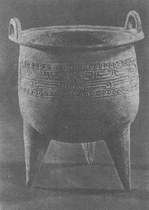 商。古代炊器,礼器。通高19厘米,口径15厘米,腹深11.8厘米。重0.9公斤。1962年陕西省铜川市三里洞出土。陕西省博物馆藏,此鼎小耳,深腹,中空三锥足,其中一耳与一足成直线,形成不平衡状态。口沿下饰联珠纹镶边的单线夔纹。此鼎是商代二里岗期最具特征的典型器物。