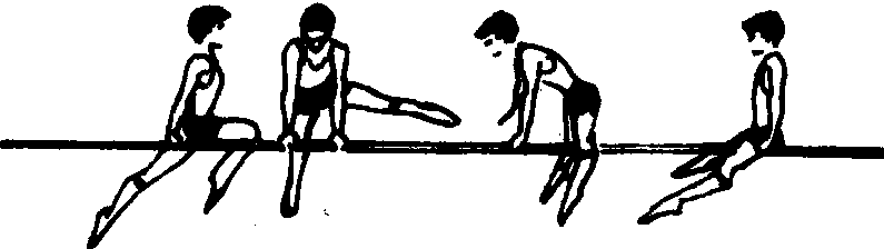 动作要领 由外侧坐开始,重心向左(右)侧移,右(左)腿向前上方举,以右左臂为轴,头、肩、胸、带动身体向左(右)转体180°;同时右左臂顶杠放手换握至另一杠,左(右)臂撑杠,成两手体前撑杠的分腿坐。 保护与帮助 保护者站在练习者杠侧后方位置,一手托背部,一手托大腿帮助举腿完成转体动作。 教学重点 ❶以肩为轴,头、肩、胸带动转体。 ❷直臂顶杠换握,挺身、展髋完成动作。 |