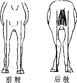 马的不正肢势之一。两前肢或两后肢的肢和蹄的正面分别斜向外方。俗称“外八字”。