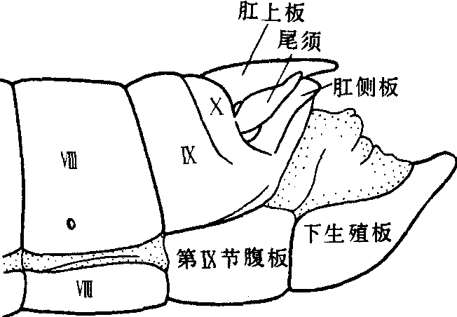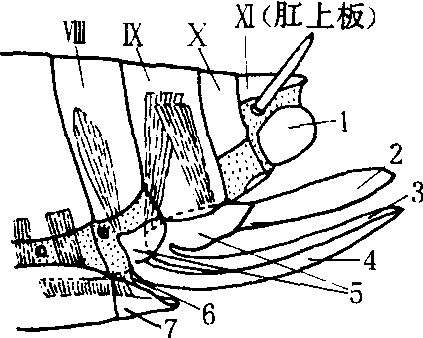 雄性外生殖器 包括将精子输入雌体的阳具及交配时挟持雌体的一对抱器(clasper或havpagon),一般发生在第九或第十腹节(图3)。