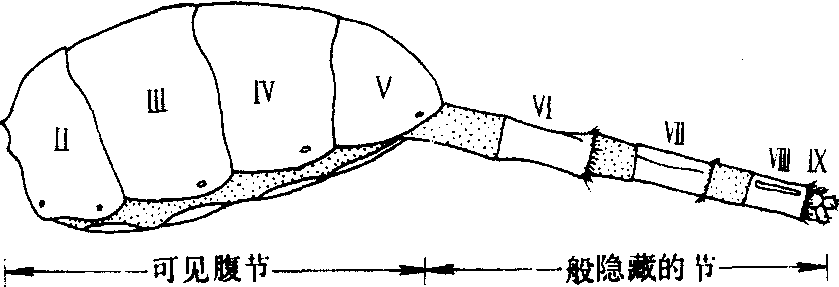 图2 家蝇雌虫腹部示产卵时端部节伸出 (仿C.G.Hewitt) ![]()