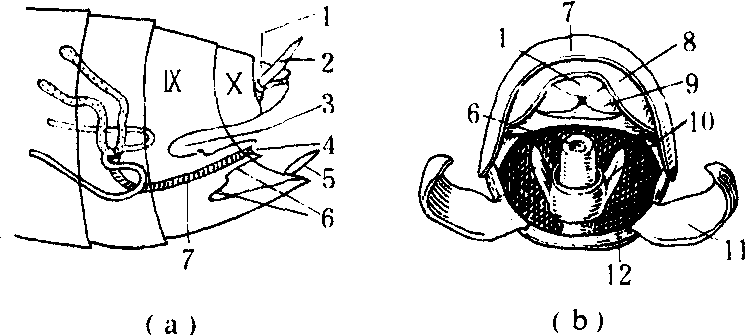 抱器 多为第九腹节的刺突或肢基片和刺突联合形成,也包括生殖节前、后腹节作为辅助交尾的突起物。抱器形状有宽叶状、钳状和钩状不等 (图3 b),仅见于蜉蝣目、脉翅目、长翅目、半翅目、鳞翅目和双翅目中。蜻蜓目昆虫的交尾器极为特殊,位于第二腹节腹面,是一种后生构造 后生的阳茎位于腹板内陷的洼中,而原来的生殖孔仍开口在第九腹节退化的阳茎上。 |