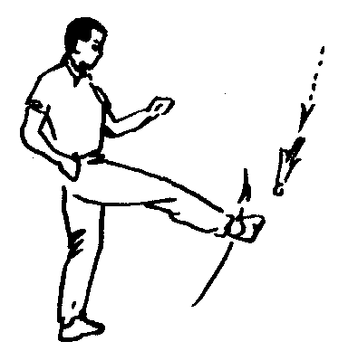 踢毽球基本技术动作之一(图2—3—82)。以右脚踢毽球为例:动作基本上与前脚背踢毽球相同。踢毽球前,左脚尖稍向外转,踢球脚脚面绷直,同时膝关节、脚尖相应内转,用脚背外侧部位迎击毽球。