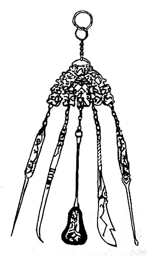 | 释义 | 多宝串duōbǎochuàn妇女所用的佩饰。用丝线把不同的宝物串在一起,悬挂于衣襟领下第二个纽扣上。宝物质料因人的身份地位而不同。常见的物件多是以珠宝金玉制成牙剔、耳挖及各式佩件。清彭养鸥《黑籍冤魂》:“不曾整顿衣服,有些歪歪扯扯;钮扣儿上扣扣了下钮;梳、挑牙杖、多宝串,挂得噜噜。”徐珂 《清稗类钞·服饰》:“多宝串,以杂宝为之,贯以彩丝。妇女所用,悬于襟以为饰。”
