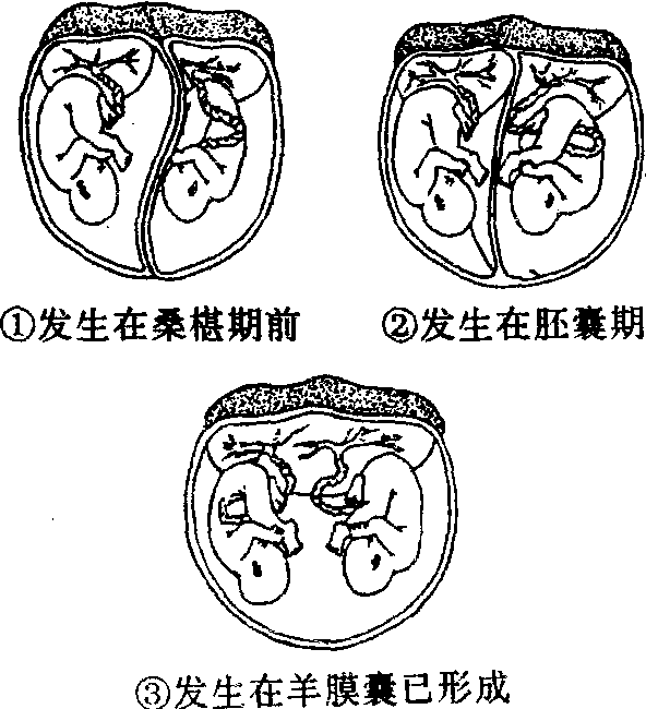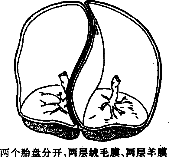 | 释义 | 多胎妊娠一次妊娠有两个或两个以上的胎儿称为多胎妊娠。根据大量统计资料推算出多胎妊娠发生率可按80n-1计算(n代表多胎数)。即双胎发生率为80例妊娠中1例,3胎为6400例中1例。根据北京协和医院1953年报道,65次分娩中有一例双胎,每662(4314)次分娩中有一例3胎。又根据我国15个医院住院分娩统计,双胎与单胎之比为1∶66。二者数字相近。但二者都是住院病人的统计数字,因而发生率较高。孕妇的胎次愈多,年龄愈大,发生多胎的机会增多,且有家族史者,发生率亦增加,双胎的发生率还有种族差异,在美国黑人双胎发生率为1.37%。白人为0.95%,欧洲双胎发生率约为1%,东方双胎发生率低,如日本约为美国的一半。各地双胎发生率差别在于双卵双胎,而单卵双胎的发生率,各地相差不多,约0.39%左右。双胎类型有两种,即双卵双胎及单卵双胎,双卵双胎的两个卵子可从同一成熟卵泡排出,或来自同一卵巢的不同成熟卵泡,或者分别从两侧卵巢的成熟卵泡排出。由于双卵双胎的两个胎儿基因不同,故其性别可相同或不相同,遗传学相似,如兄弟姐妹。罕见情况下,双卵双胎(又称双合子双胎)的两个精子可来自不同的父亲,有报道一个来自白人,一个来自黑人。双卵双胎的两个受精卵各自种植在子宫的不同部位,形成两个独立的胎盘和胎囊。有时两个胎盘紧接在一起,以至互相融合。大多数两个胎囊之间的中隔是由两层羊膜和两层绒毛膜组成(见图6.6-6)。且二者血循环互不沟通。单卵双胎由一个受精卵分裂而成,约占双胎妊娠的1/3。由于胎儿基因相同,故其性别相同,容貌相似。单卵双胎的胎盘、胎膜和受精卵的分裂时间有直接关系(见图6.6-7)。如双胎形成是在受精后的3—4天内(即桑椹期前),每个胎儿具有自立的胎盘、羊膜和绒毛膜,两胎囊间的中隔与双卵双胎相似,由两层羊膜及两层绒毛膜组成。此类双胎在单卵双胎中约占1/3。通常单卵双胎发生得稍晚些,约在受精后5—10天,相当于囊胚期,两个胎儿具有共同的胎盘,两个胎囊间的中隔为两层羊膜,这种情况占单卵双胎的2/3。极少数单卵双胎发生得更晚,于受精后10—14天,则两胎儿共有一个胎盘,共存于一个胎膜内。此种情况在单卵双胎中少于1%。两个胎儿的脐带容易扭在一起,造成胎儿死亡和流产。如受精卵分裂在受精后第14天或以后,则将导致不同程度、不同形式的联体双胎。单卵双胎的胎盘间往往有血液循环相通,可有动脉—动脉、静脉—静脉、动脉—静脉3种。动脉—静脉吻合可引起严重的不良后果,称双胎输血综合征,即一个胎儿(受血者)接受单卵双胎的胎膜类型了另一胎儿(供血者)的大量血液,以致受血胎儿血量增多,心脏肥大,体重增长快;另一供血胎儿则出现贫血、脱水、体重轻。严重时可因贫血营养不良而死亡,受血者亦可因血量过多,生后24小时死于心力衰竭。无论单卵或双卵双胎,如其中一个胎儿早期死亡,可被另一胎儿压成薄片,如一张纸,称纸样胎儿。双胎的诊断和鉴别诊断:有多胎妊娠家族史或妊娠前曾接受促排卵药物(如克罗米芬等促排卵药可使卵巢排卵数目增加),应注意有无多胎妊娠的可能。产前检查发现子宫增长大于妊娠月份,或摸到3个大部分(头或臀),或发现胎头较孕周小,与增大子宫不成比例,应想到有双胎的可能性。进一步听胎心,发现有两个胎心,而这两个胎心是完全可分开的(在两个胎心音之间隔着一无音区),即可诊断为双胎。双胎应和羊水过多,巨大胎儿,妊娠合并子宫肌瘤或卵巢囊肿鉴别。自从应用B超辅助诊断以来,早至妊娠7—8周的双胎,可在B超下见到两个妊娠囊。12周后可见到两个胎头。