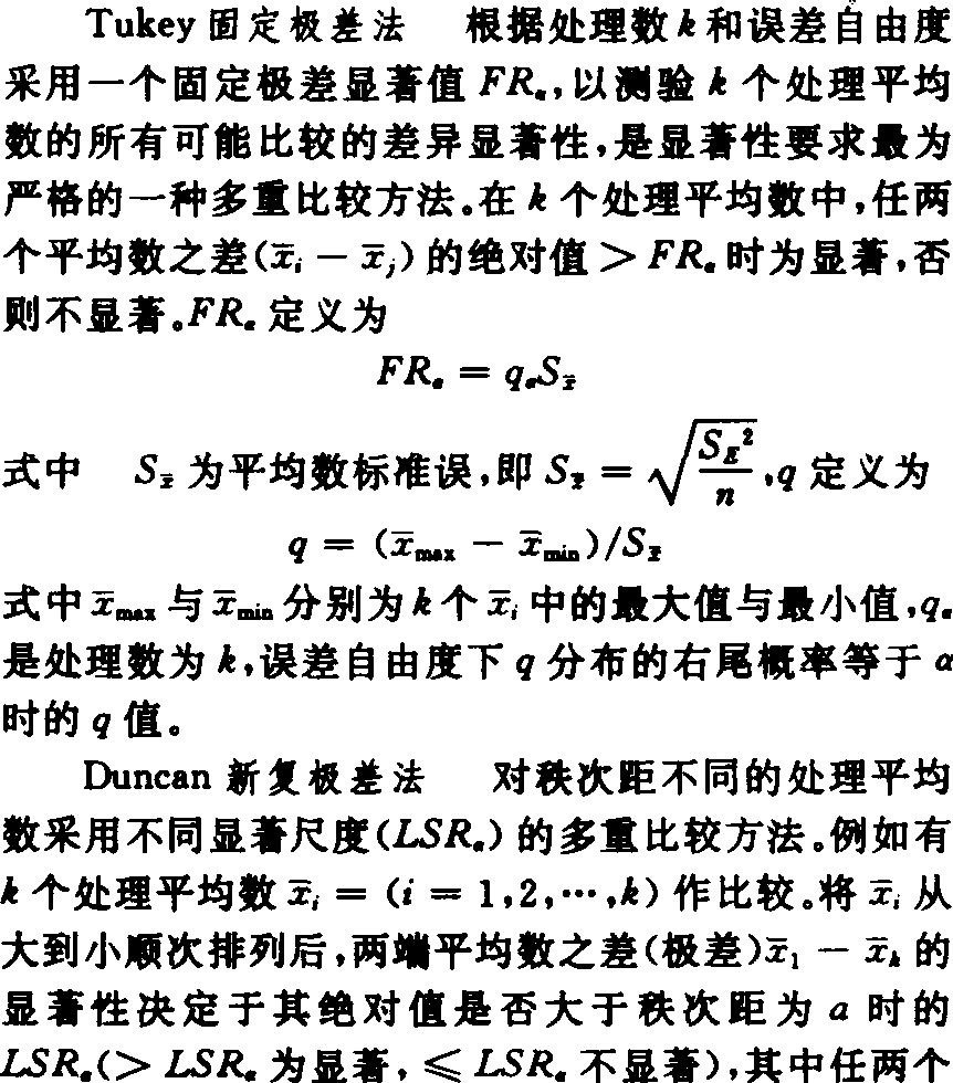 平均数之差xi-xj的显著性(i< j),由这两个平均数的秩次距(a=j-i+1)下的LSRa来判定,当|xi-xj|>LSRa为显著,否则不显著。LSRa定义为 LSRa=SSRa×Sx 式中 SSRa是保护水平P=(1-a)a-1,显著水平为a时,以平均数标准误为单位的标准化最短极差,随秩次距a和误差自由度而异。 学生氏复极差检验 简称q检验。其检验程序和新复极差法相同,但LSRa定义为LSRa=qa×Sx式中qa与Tukey固定极差法中的qa相同。在相同秩次距a下,qa比SSRa更为严格。 多重比较multiple comparisons统计分析上,当方差分析的F测验表明处理间有显著差异时,进一步所进行的具体样本各平均数相互间的差异显著性比较。有最小显著差数法和最小显著极差法等。 |