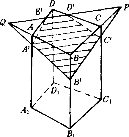 例 如图,ABCD-A1B1C1D1是一个四棱柱,A′,B′,C′分别是侧棱AA1,BB1,CC1上的点,求作过A′,B′,C′三点的截面. 解 连结B′C′与BC 的延长线交于P.因为B′C′⊂平面A′B′C′,所以P∈平面A′B′C′. 连结B′A′与BA的延长线交于Q.因为B′A′⊂平面A′B′C′,所以Q∈平面A′B′C′. 因为P∈BC,Q∈BA,所以P∈平面AC,Q∈平面AC. 连结PQ,直线PQ和CD,AD分别交于D′,E′. 连结A′E′,C′D′, D′E′,则A′E′⊂平面A1D,C′D′⊂平面C1D,D′E′⊂平面AC. 因此五边形A′B′C′D′E′就是所求的截面. |