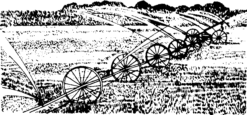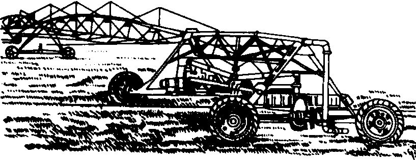 图1 滚轮式喷灌机 端拖式喷灌机 由十几根外径100毫米铝管联接成的400多米长的喷洒管道,利用许多滑橇和轮架支承,每隔12~18米装有竖管、喷头和溢水阀。实行定点喷洒,由拖拉机牵引变换作业地块。 中心支轴式喷灌机 也称圆形喷灌机或时针式喷灌机。1952年美国富兰克·佐巴奇(Frank Zybach)首先获得发明水动圆形喷灌机的专利权。它由中心支座、塔架车、喷洒桁架,未端悬臂和电控同步系统等部分组成。几跨装有喷头的桁架支承在若干个塔架车上,用挠性接头联接,以适应坡地作业。在每个塔架车上又配有水动装置或0.75~1.1千瓦电动机作为行走动力,并配有专用电控同步系统进行同步运行控制,绕着中心支轴旋转,从而实现喷洒支管连续自移喷洒作业,湿润一个圆形面积。世界上最大的圆形喷灌机长803米,转一周能浇灌212公顷土地。中国生产的DYP—415型电动圆形喷灌机长415米,喷水量为220米3/小时,进水压力500千帕,转一周能浇灌土地62公顷,同时还能喷洒化肥和农药。一般喷洒均匀度为85~90%。圆形喷灌机的缺点是,方形地块的四角有漏喷区。为了改善这种状况,常用安装角喷装置或用中小型喷灌机进行补喷。 平移式喷灌机 借助于电动圆形喷灌机的基本结构和电控同步系统,以保持塔架之间的良好对直而平行移动(图2)。1980年出现于美国,它的平移导向系统有两种方法:❶用塔架车上的导向天线接收地埋导线发出的信号,沿地埋线方向平移向前。 ❷采用传感器和钢索进行导向,沿钢索方向平移向前,行喷农田。美国9880型平移式喷灌机,长为792米,配套动力100千瓦,喷水量437米3/小时,前进速度1.98米/分,田块覆盖率达98%,喷洒均匀度为90%以上。