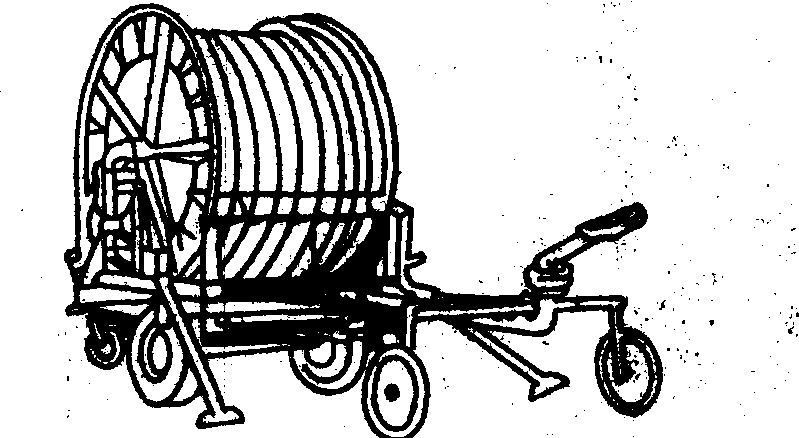 图3 绞盘式喷灌机 钢索牵引式喷枪车 采用钢索牵引,其后面拖曳着一条涂塑软管输水的远射程喷灌机。作业时,软管一端接上水栓,再借用拖拉机顺着灌区地段将软管卷展开,然后把钢索固定在地头对面的锚桩上。当水源接通后,喷枪车拖曳着软管朝着水栓方向卷起钢索,每次行驶可灌溉0.9~7.6公顷农田。 |