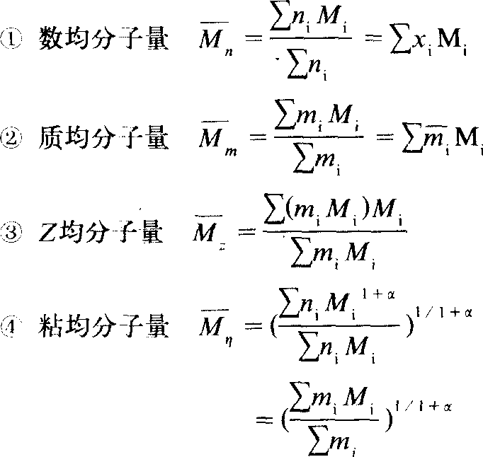 α——马克-豪温克粘度——分子量方程中的参数,数值在0.5~1.0之间。 用膜渗透压法可得数均分子量,用光散射法得质均分子量,用超速离心沉降平衡法得Z均分子量,用粘度法测定可得粘均分子量。在一般情况下,多分散高聚物的 ![]() |