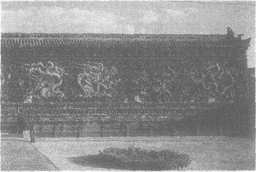 | 释义 | 大同琉璃九龙壁位于山西省大同市东街,建于明洪武二十五年(与元1392年)长45.5米,高8米,厚2.02米,是我国现存最早最大的一块九龙壁,由壁座、壁身、屋顶三部分组成。壁座为须弥座,束腰部位雕虎、狮、象、狗、兔、狻猊和麒麟等动物,个个栩栩如生。壁身是九龙壁的主要部分,九条大龙在波涛云气间驰骋。龙与龙之间浮雕水草、山石,五彩斑斓。龙的造型古朴精致,姿态各异。特别是中间的一条龙,位于照壁中心,姿态端正,颜色为正黄色,气势十足。壁身之上为仿木构的庑殿顶。正脊两侧浮雕莲花。游龙两端为龙吻。其他如斗拱、额枋、飞檐等一一俱全。全壁由426块黄、绿、赭、紫、蓝等色琉璃构件镶嵌而成,色泽浑厚,雕塑精美,气势壮观。琉璃是一种带色陶釉,多用于建筑的艺术装饰。其胎以陶土制作,施以含有氧化铅的琉璃釉,多为二次烧成,具有绚丽多彩的釉色。琉璃工艺在战国时期已出现,明清两代为其兴盛期,最主要的产地是山西。
