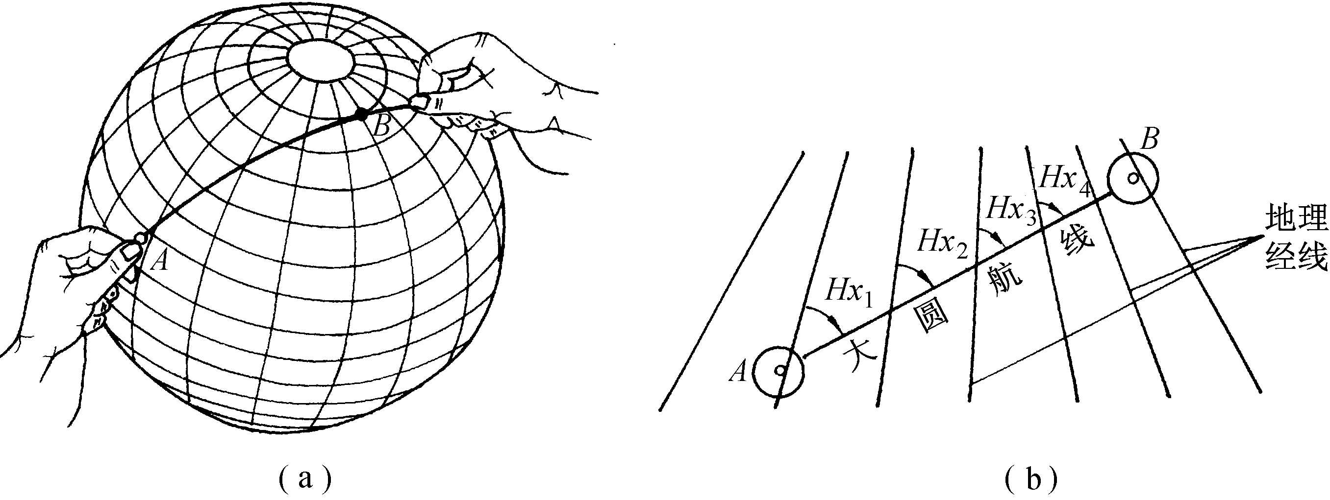 | 释义 | 大圆航线great circle track船舶沿着地球上两点之间最短距离航行的接近大圆弧的“航线”。由于地球上除赤道和子午线以外,大圆弧与所有子午线的交角都不相等,船舶沿大圆弧航行,必须不断地改变航向,这在实践中很难做到,因此,将大圆弧分成N段,每一段按恒向线航行,分段愈多,航线愈接近大圆弧,所以大圆航线是近似大圆弧的航线。航海实践中,一般以经差5°或10°一天左右的航程作一分点。大圆航线一般应用于中、高纬度及横跨经度较大的海区。 大圆航线great circle course地球表面航线起点与航线终点的最短连线。如图(a)所示,亦即地球表面两点与球心构成的平面与地球表面相交形成的大圆圈的一部分。其特点是航线距离最短,但航线角各处不相等,如图(b)所示。在远距离飞行中,保持固定的初始航线角飞行,将会偏离预定航线,所以需要根据航线角的变化而修正飞行航向。实际飞行中常常采用大圆航线,以便缩短航程节省燃油。