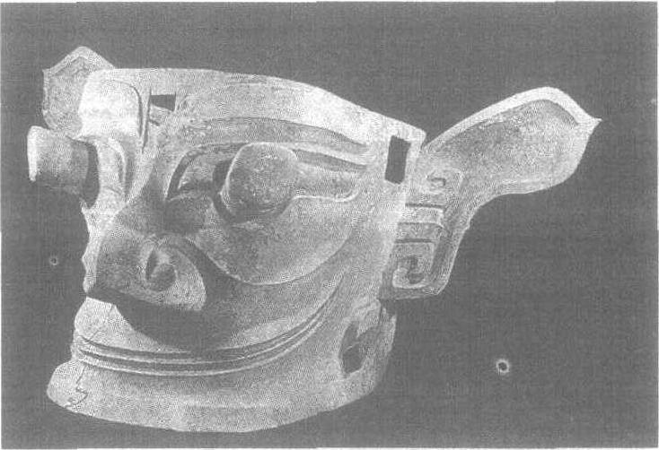 大型青铜人面像 1990年三星堆祭祀遗址部分出土铜人、铜面具在北京展出引起巨大轰动。雕塑家们惊叹,三千多年前古代匠师就已运用块面分割、以线造型等手段,将人物按解剖分解、归纳方、圆、三角等形体,并运用高超的铸造工艺使其有机地融为一体,不失为伟大的创造。这些作品完全可以和同时期的古埃及雕塑论高下。 |