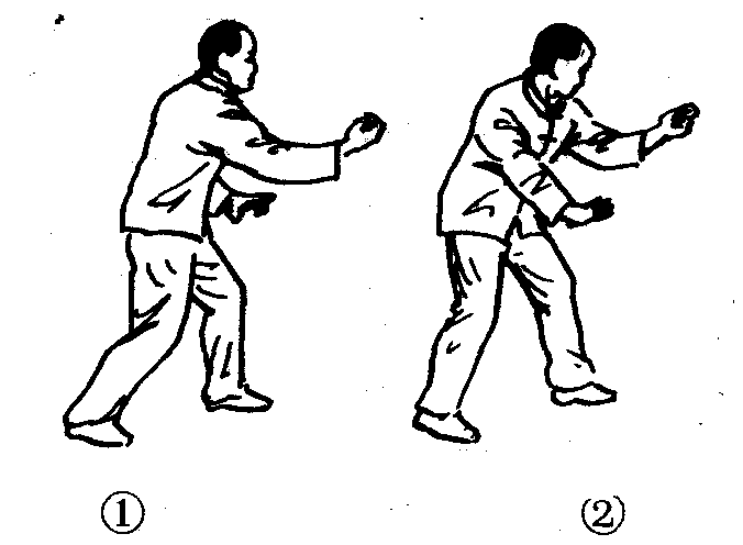 大成拳的基本拳法之一。为左右拳向前击打的动作。预备式为左技击桩。动作过程:崩右拳时右腿蹬地,上体向左拧转,使身体重心移至前脚,同时右掌变拳向前击出;左掌随之内旋,经右拳上方向后拉至腹前;头上顶,略向左转,目斜视前方。(图2—4—86—❶)崩左拳时左腿蹬地,上体向右拧转并微侧倾,使身体重心移至右脚内侧;同时左掌变拳向前击出,右拳变掌内旋,经左拳上方后拉至腹前;头上顶,略向右转,目斜视前方。(图2—4—86—❷)大成崩拳试力时左右拳依次缓慢前击;发力时可快速击打一拳,或左右拳依次快速前击。动作要领:右崩拳时要注意右髋内合,左腿向后撑顶,左掌用力(意念用力)回拉;左崩拳时要注意上体向右倾闪,右腿向前撑顶,右掌用力(意念用力)回拉。意念:想象出拳时似破壁而出。注意事项:老年初学者练习时要特别注意拳、掌的变换。