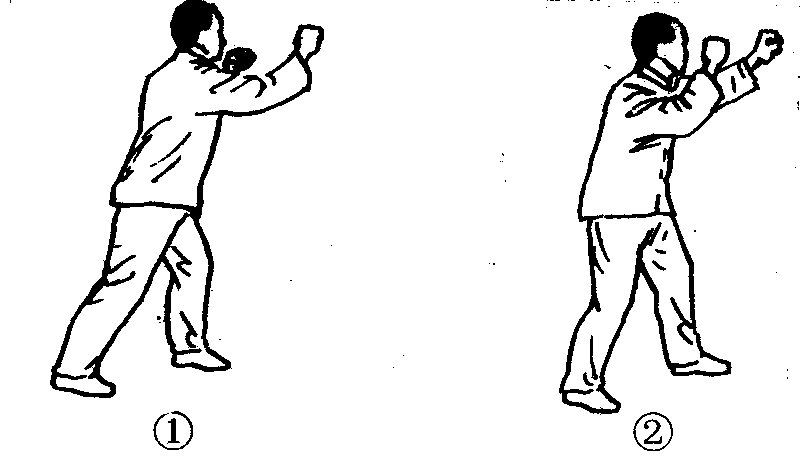 | 释义 | 大成炮拳大成拳的基本拳法之一。为左右拳向前上击打的动作。炮拳试力使双拳沿身体前面的三个假设圆圈路线连续慢速练习,一个是在身体正中线上与矢状面平行的圈,为进攻圈;另外两个圈在身体左右两侧与身体额状面平行,为防守圈。炮拳发力则是一拳或两拳沿直线向前快速击出。预备式为左技击桩。动作过程:右炮拳:右腿蹬地使身体重心移至前脚,同时上体稍左转,右拳沿进攻圈,左拳沿左侧防守防圈同时出击,各划一圈后还原成左技击桩;头稍右侧,目斜视前方。(图2—4—87—