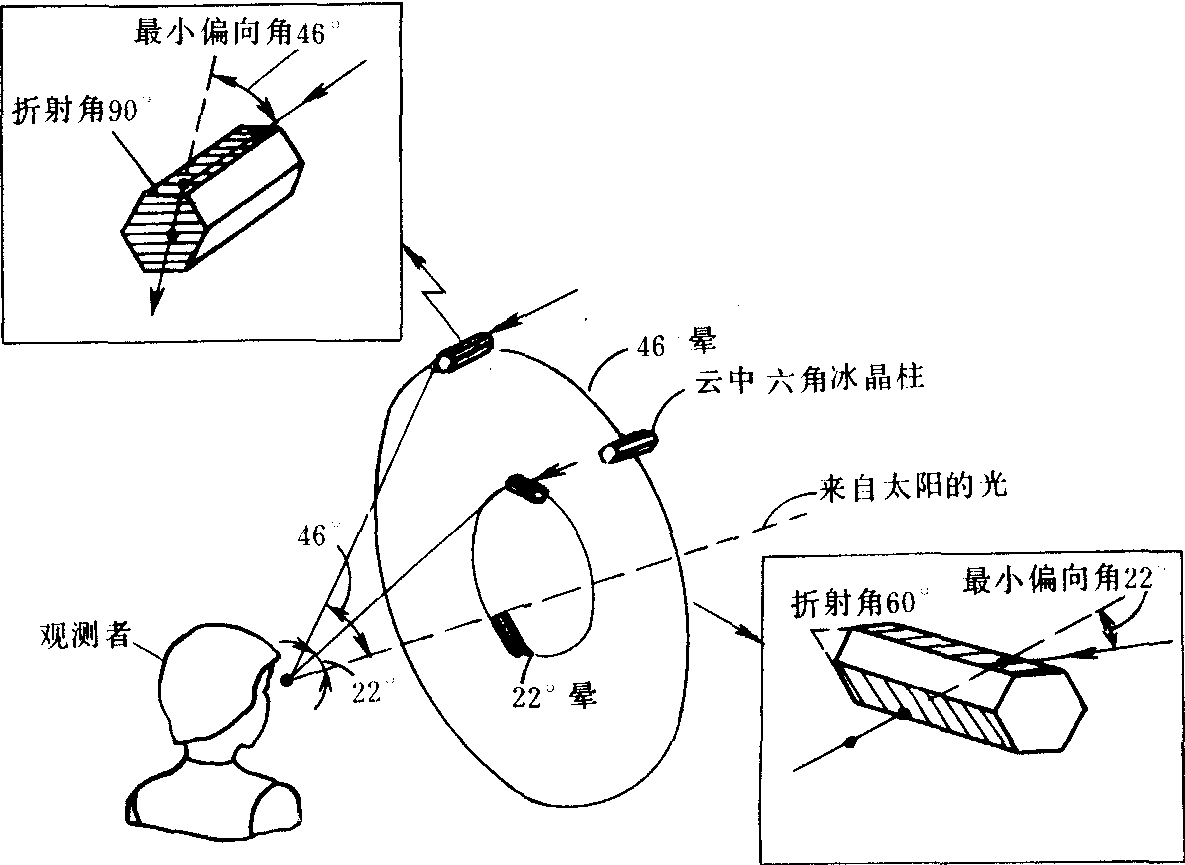 晕 日、月光线通过云中冰晶发生折射或(和)反射而产生的位于日、月周围的光圈、光柱、光弧、光点的总称。最常见的晕是角半径为22°的晕,是由光线通过六角柱状冰晶上相互交成60°的两个侧面而产生折射所形成,其光路的最小偏向角为22°,即折射的最大强度,正好在距光源为22°处。晕多出现在卷层云或卷云上,有时光圈不全(见彩图54)。月晕多白色。日晕色彩排列内红外紫,内侧最亮,具有相当明显的边界,愈往外亮度愈弱。角半径为46°的晕较少见到,产生这种晕时, 日、月光线需通过六角柱状冰晶上的一个侧面及一个底面,如图。早晚太阳高度角甚低时,有时可见一条白色光柱, 直贯太阳, 称为日柱。它与假日环、日珥、假日、反日、日角等都属日晕的范畴。晕的出现常是天气将要变化的一种预兆, 许多古代的天气谚语和晕象有关, 如“日晕三更雨, 月晕午时风”等。
