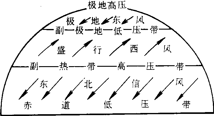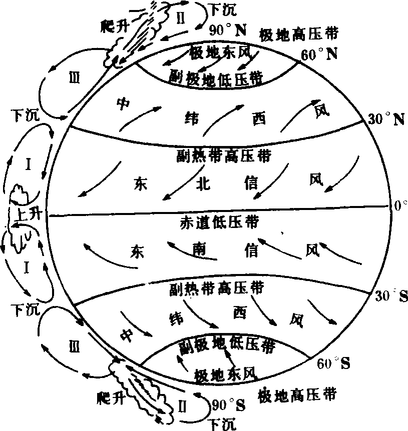 图 4 世界7月海平面气压图 大气环流Daqi huanliu指运动规模比较大、持续时间比较长、变化比较缓慢的大气运动。它反映着大气运动的基本状态和变化特征,孕育和制约着较小规模的气流运动,是各种规模系统形成和发展的基础,是各地天气、气候形成、演变的背景。它使高低纬度之间和海陆之间的热量和水汽得到交换,从而促进地球上的热量平衡和水量平衡。形成大气环流的主要因素是:高低纬之间受热不均和地转偏向力。在南北半球各有方向相反的三圈环流:低纬环流、中纬环流、高纬环流(如图所示)。由于海陆分布、地形起伏等因素的影响,地球上还存在各种不同规模的大气环流。反映大气环流的基本特征需要采用平均图,即时间平均和空间平均图。因为通过时间平均可以把那些时间短暂、瞬息万变的环流系统滤掉,显现出存在时间较长的稳定的基本形式;通过空间平均可以把一些规模较小的系统滤掉,显现出各纬圈上环流的基本特征。比如平均纬圈环流:大气环流基本上是水平运动,而水平运动又以极地为中心旋转着的纬向气流最盛行,南半球更为显著。对流层的低纬度地区盛行东风,称东风带,又称信风带,其范围随高度减小,风向风速比较稳定。中高纬度地区盛行西风,称西风带,其所跨纬度除低层外,均较东风带为宽。中纬度地区西风的强度随高度迅速增大,最大风速出现在30—45°上空200百帕附近,称为西风急流。极地附近低层是较为浅薄的弱东风,称极地东风带(如图所示)。此外还有平均经圈环流和平均水平环流,它们相互联系、相互制约,共同构成了大气环流整体。广义的大气环流还包括季风环流、海陆风、山谷风,以及气旋、反气旋等。