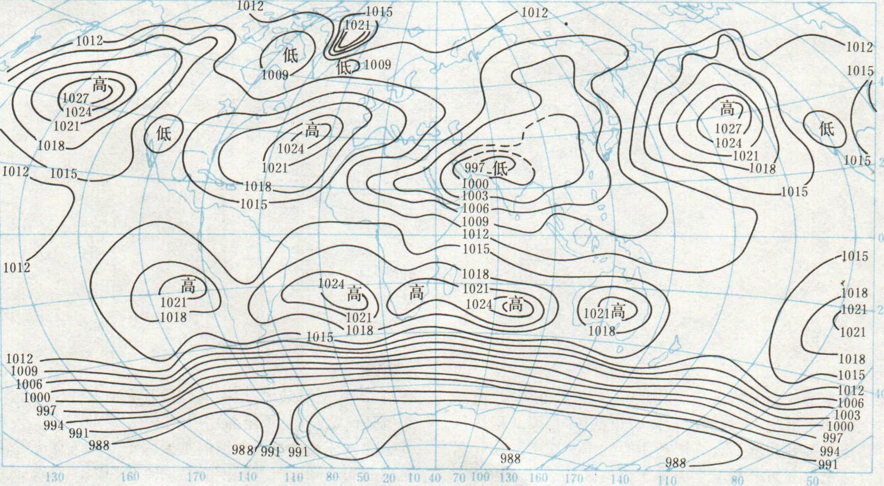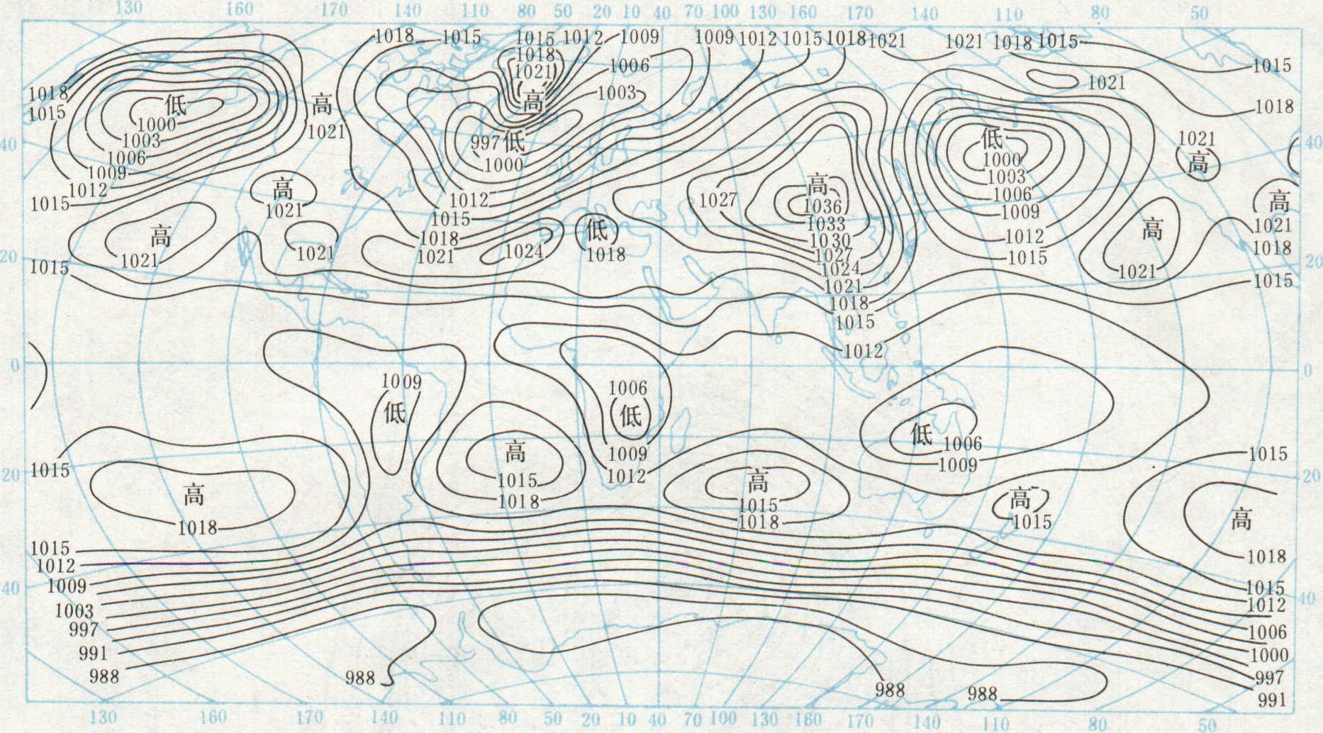 图2(b) 北半球7月500hPa等压面图 大陆上形成两个热低压(亚洲低压、北美低压), 海洋上的两个低压(冰岛低压、阿留申低压)很弱, 副热带高压增强并北移。大气活动中心的季节交替, 在亚洲大陆上最显著, 基本上决定了该地区的天气和气候。季风也是大气环流的组成部分(见季风气候)。从广义上说,因局地因素产生的以日为周期的空气流动(局地环流), 包括海陆风、山谷风以及其它地方性风系也属大气环流范畴(见下垫面)。 大气环流是形成气候的重要因子。大气环流异常是引起大范围天气和气候异常的直接原因, 对农业生产影响很大。研究大气环流规律, 对解决中、长期天气预报、气候学的理论和实际问题有重要意义。