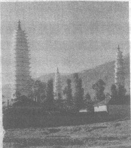 大理三塔 大理三塔古代佛塔建筑,是崇圣寺三塔的俗称。在云南省大理白族自治州大理市西北,位于旧城西北1公里处。始建于唐代,原为崇圣寺建筑的一部分。寺庙早已毁。主塔名“千寻塔”,约建于南诏保和时期(824—839年),塔高69.13米,共16层,为多层密檐式砖塔,自下而上逐渐收缩,方形,中空,塔身每层正面均开券龛,龛中置白色大理石佛像一尊。塔顶四角各有一只铜铸的金鹏鸟。南北两小塔均为八角形多层塔,雕有各式图案纹样,塔顶是3个衔接的铜制葫芦。两小塔各10层,均高42.19米。建于五代。1978—1980年在进行维修时,于千寻塔塔基及塔顶发现南诏、大理国的重要文物680件。三塔矗立于苍山洱海之间,构成一幅美丽的图画。为全国重点文物保护单位。 大理三塔即“崇圣寺三塔”(992页)。 |
