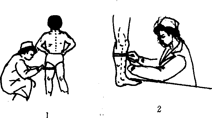 测量时,要求受试者穿短裤,两脚自然分开与肩同宽。测试者用皮尺测量大腿与臀部交界处(臀皱折处)的周长,即为大腿围。用皮尺测量小腿最粗处(小腿上三分之一与三分之二交界处)的周长,则为小腿围。 |