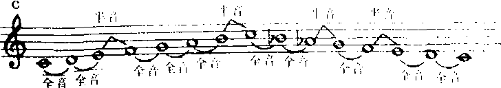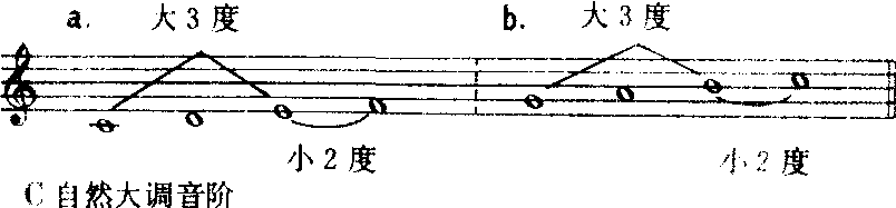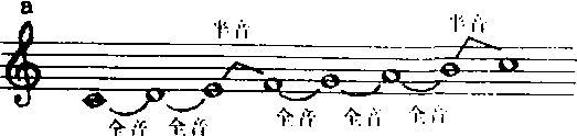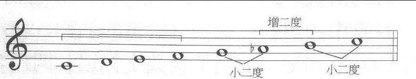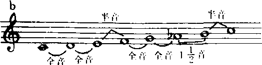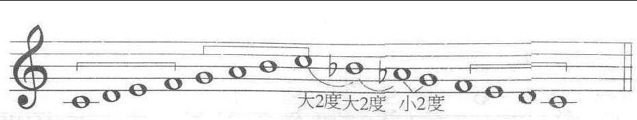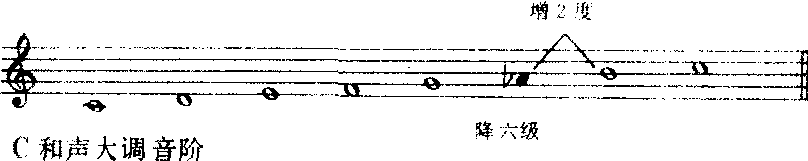 ❷和声大调:大调音阶上行和下行时,将第六级音降低半音,使第六与第七音之间形成增二度音程,音阶结构如下: