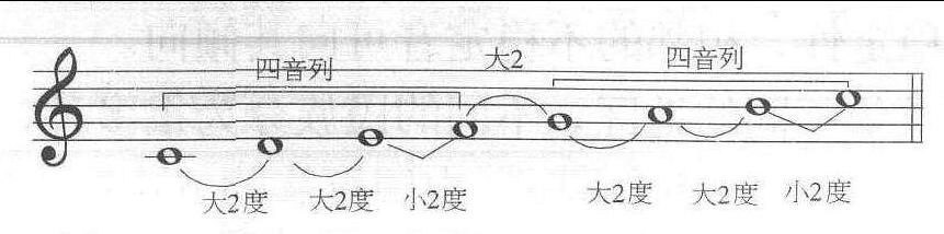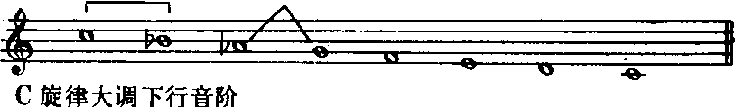 ❸旋律大调:大调音阶下行时,将第七级及第六级音各降低半音,使第八级音与第七级音形成大2度,第六级音与第五级音形成小2度音程。音阶结构如下: