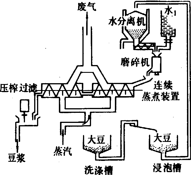 大豆饮料 用原料大豆和脱脂豆粕为原料生产的饮料,主要有: ❶豆浆。工业化制作豆浆采用连续生产,其工艺流程见图。先将大豆清洗浸泡,再将浸泡好的大豆经分离机分离脱水后由输送装置定量送入磨碎机,同时向磨碎机定量加水,磨浆后送入连续蒸煮装置内,用蒸汽加热蒸煮,再经加压过滤,即为鲜豆浆。由于普通豆浆中有豆腥味,其原因主要是大豆中含有脂肪酸氧化酶,若在浸泡和煮沸时,加入0.5%碳酸氢钠,并煮沸,可以钝化脂肪酸氧化酶,消除豆腥味。