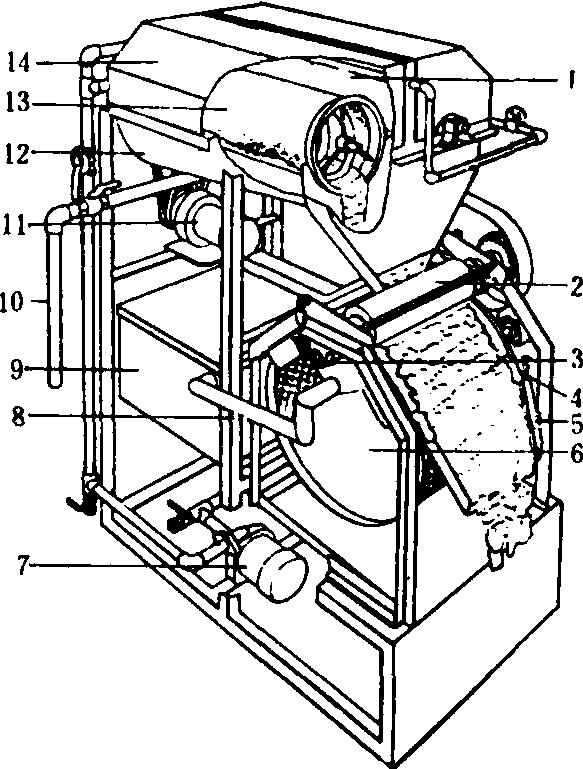 图3 组合滤浆机 1.洗涤用蒸汽管;2.加压橡胶辊;3.接浆槽;4.刮板;5.豆渣接受板; 6.滤浆筒;7.泵; 8.输浆管; 9.沫糊罐; 10.豆浆取出管;11.电机; 12.豆浆罐;13.滤浆圆筛;14.滤浆圆筛罩 煮浆设备 专用于加热煮沸豆浆,使浆中蛋白质受热,适度变性,并使大豆中生理有害物质失去活性,杀死细菌并消除豆腥味。煮浆设备有间接加热和直接加热两种方式。间接加热的热效率低,易结垢。直接加热使用蒸汽,热效率高,不结垢,但蒸汽需要过滤。按煮浆温度分为常压式(100℃以下)和密封加压式(100℃以上);按煮浆过程分为连续式和间歇式。连续式煮浆罐,罐径为0.5米,罐高由0.65米递减0.08米的5只罐组成,相邻两罐间用溢流管相连通,5只罐的温度分别为40℃、60℃、80℃、90℃、95~98℃,每小时可煮浆5~7吨。移动隔板式连续煮浆机,煮浆机为一断面呈U形的长槽,其中安装有由链条带动的隔板,豆浆在隔板的推动下,依次经过U形槽底3个温度不同的蒸汽室,完成蒸煮过程。隔板边缘有橡胶密封条,与U形槽底形成密封,避免生浆与熟浆相混。 凝固设备 在熟浆中添加凝固剂,使其成为凝胶物的设备。手工凝固一般采用陶土缸和保温的金属容器,人工搅匀凝固剂。自动凝固设备则包括豆浆及凝固剂的定量装置、凝固桶、传动装置、凝固搅拌器、破脑器和成型箱等。 压榨脱水设备 将豆腐脑中的黄浆水压出,并使其成型的设备。压榨脱水设备可利用重物、手动或电动螺旋、液压或气动等方法进行加压,有断续加压和连续加压之分。断续式空气加压脱水机,由水平回转的型箱传动链及其上方的一系列压榨气缸组成。型箱在一定时间内依次从每个不同压力的气缸下面通过,受到压榨型箱进入端的气缸压力较小,而排出端的压力较大。连续式空气加压脱水机的结构与断续式基本相似,只是在压榨过程中,压力部件与型箱始终保持接触,一起同步移动。 豆奶生产设备 可将大豆直接制成豆奶,其工艺流程如图4所示。全过程中使用的主要设备包括脱皮机、磨浆机、浆渣分离机、调合搅拌罐、杀菌除臭装置和高压均质机等设备。其中磨浆、分离与豆腐加工使用的设备相同。一般采用干法脱皮,相应的脱皮机由烘干、破碎、风选分离三部分组成。通常采用的破碎设备如图5。脱皮后的大豆放在筒形容器内,通人蒸汽短时间加热或用碱性热水浸烫,使大豆中的脂肪氧化酶钝化。调合搅拌罐将加入豆奶的植物油、糖、钙等成分搅拌均匀,可制成不同风味的豆奶。杀菌除臭装置通常由一个可使豆奶与140℃的高压蒸汽进行短时热交换的加热器,以及用以减压脱臭的脱臭罐所组成。