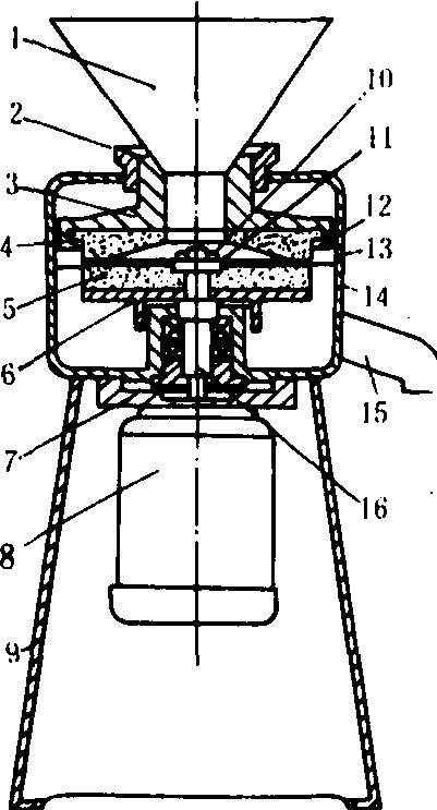图2 砂轮磨浆机 1.料斗; 2.调节手轮;3.上固定盘;4. 上磨片; 5.下磨片; 6.下固定盘;7. 法兰盘; 8.电机; 9.机座; 10.螺母; 11.垫片; 12.压紧环;13.上磨箱; 14.下磨箱;15.出料口;16. 主轴 滤浆设备 从沫糊(又称豆糊)中提取豆浆的设备。按滤浆方式不同,可分为筛分式、离心式和挤压式三类。使用的滤网一般为27~47孔/厘米。筛分式有振动平筛和旋转圆筛等。离心式浆渣分离机的工作部件是内表面安装着滤网的锥形转鼓(筛篮)。转鼓小端内部设有与进料管相通的分配盘。沫糊从进料管流到高速旋转的分配盘时,在离心力作用下,均匀地沿转鼓内表面从小端向大端移动。豆渣沿滤网不断地被推向转鼓大端而排出,豆浆则穿过滤网流向外壳,集中排出。挤压式浆渣分离机有等螺距变直径和等直径变螺距两种。沫糊由螺旋推向压力门的过程中,由于螺距间空间容积逐渐减小,沫糊受挤压,豆浆经筛筒滤出。豆渣被螺旋推至端部,挤压弹簧压力门而排出。调压弹簧用以控制滤净所需的压力。图3是日本豆制品生产线比较常用的一种筛分与挤压组合滤浆设备。沫糊先经圆筛滤出第一道浆(存入豆浆罐),再将所得的渣稀释,经挤压胶辊与滤浆筒挤出浓度低而含细渣的豆浆,此浆流入沫糊罐与沫糊混合,再泵送到滤浆圆筛过滤,以降低豆渣中残留的蛋白质。