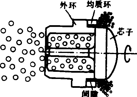 图5 干法脱皮用破碎设备 均质机的作用是使浆液混合物颗粒达到均匀细化的目的。主要包括高压泵、反压装置和均质头。均质头的工作原理如图6所示。豆奶混合液由高压泵送入外环与芯子之间的缝隙,在此细缝中,混合液受阻,高压能被转化成动能,混合液颗粒受到极大的剪切力和冲击力等作用,达到均质的目的。