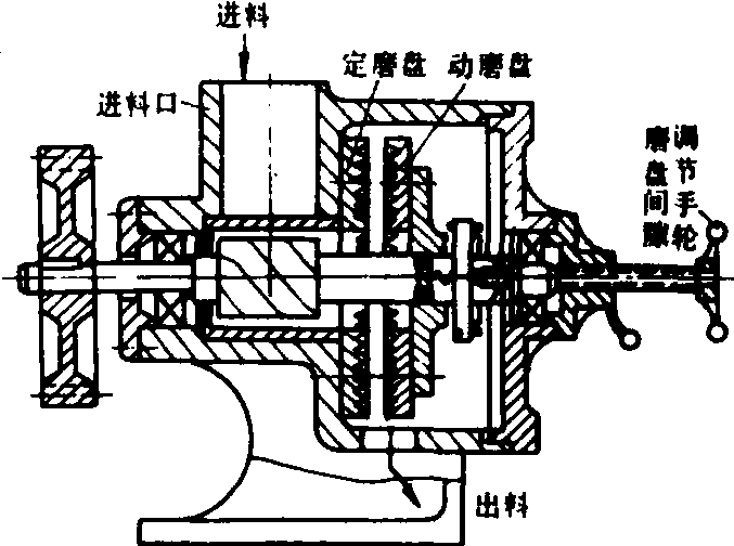 图1 豆腐生产工艺流程 清洗设备 用来清除大豆中的杂物,有干选和湿选两种方法。干选通常采用组合清理机,主要由风选、筛选、比重去石、磁选四部分组成。湿选是利用大豆与杂物的比重不同,在水中沉浮的办法进行清选的。它既有清除杂物又有清洗大豆表面的作用。按工作原理不同,分为沉降式和旋流式两种清选装置。沉降式是一个与水平面呈30°倾角的流槽,长4~5米,槽底每隔1米设有贮存比重较大的金属杂质和石子的凹斗,在水中冲洗的大豆,沿槽流至末端金属网上,沥去表面水。旋流式是将大豆和水以大约1:3的比例放入洗豆槽,经输送泵送入旋风分离器,豆水混合物由分离器上部排出,比重大的石块等杂物留在分离器底部,由阀门定期排出。 磨浆设备 用来将浸泡膨胀后的大豆磨制成沫糊浆,使其细胞膜破裂,蛋白质溶于水中。常用的是片磨和锤式粉碎机。片磨通常有石磨、钢磨、砂轮磨之分,通常采用能使浆渣自动分离的砂轮磨。图2是砂轮磨浆机。