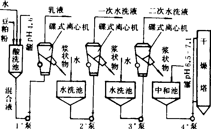 图7 离心喷雾干燥机 大豆蛋白生产设备 从脱脂大豆粕中提取大豆蛋白的设备。主要包括生产浓缩大豆蛋白,分离大豆蛋白和组织状大豆蛋白的设备。 浓缩大豆蛋白生产设备 将脱脂豆粕浸于稀酸或酒精中,经过分离机提取沉析,清洗沉析及中和处理,然后干燥制得产品的设备。稀酸浓缩蛋白质的工艺流程如图8所示。其中关键设备之一是碟式离心机,它将所需沉析的浆状物与可溶性糖及其它可溶性物质,以及水洗废液分离。最终产品采用喷雾干燥机干燥。浓缩大豆蛋白的蛋白质含量达到70%以上。