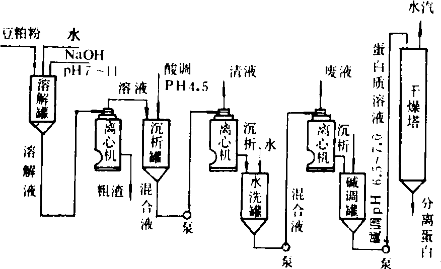 图8 稀酸浓缩蛋白流程 分离大豆蛋白生产设备 将低温脱脂豆粕在水或碱液中溶解,用离心机去除残渣,用酸沉析蛋白,经水洗,中和及干燥制得大豆蛋白的设备。分离大豆蛋白的蛋白质含量可达到90%以上。分离大豆蛋白的工艺流程如图9所示。